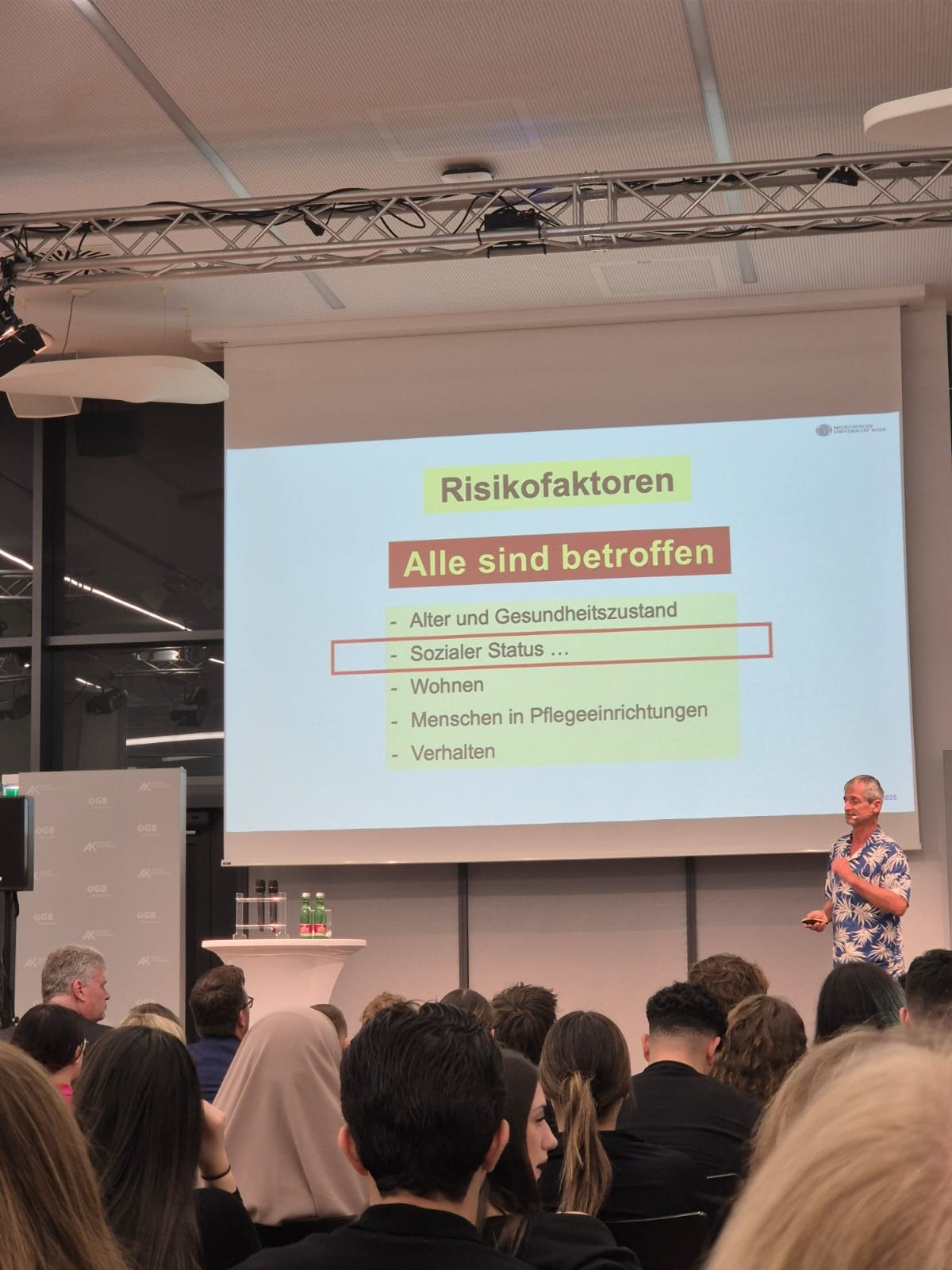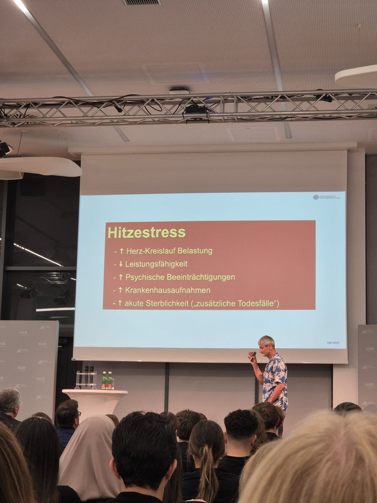 Dr. Hutter zeigte eindrucksvoll auf, wie stark steigende Temperaturen und häufigere Hitzewellen den menschlichen Körper belasten – besonders in beruflichen Situationen, in denen körperliche oder organisatorische Anforderungen hoch sind. Er erklärte, welche gesundheitlichen Risiken dadurch entstehen können, etwa Kreislaufprobleme, Konzentrationsschwierigkeiten oder die Gefahr von Überhitzung. Ebenso thematisierte er Möglichkeiten zur Prävention, darunter ausreichende Flüssigkeitszufuhr, angepasste Arbeitszeiten, schattige bzw. gut belüftete Arbeitsplätze sowie ein verbessertes Bewusstsein für Warnsignale des Körpers.